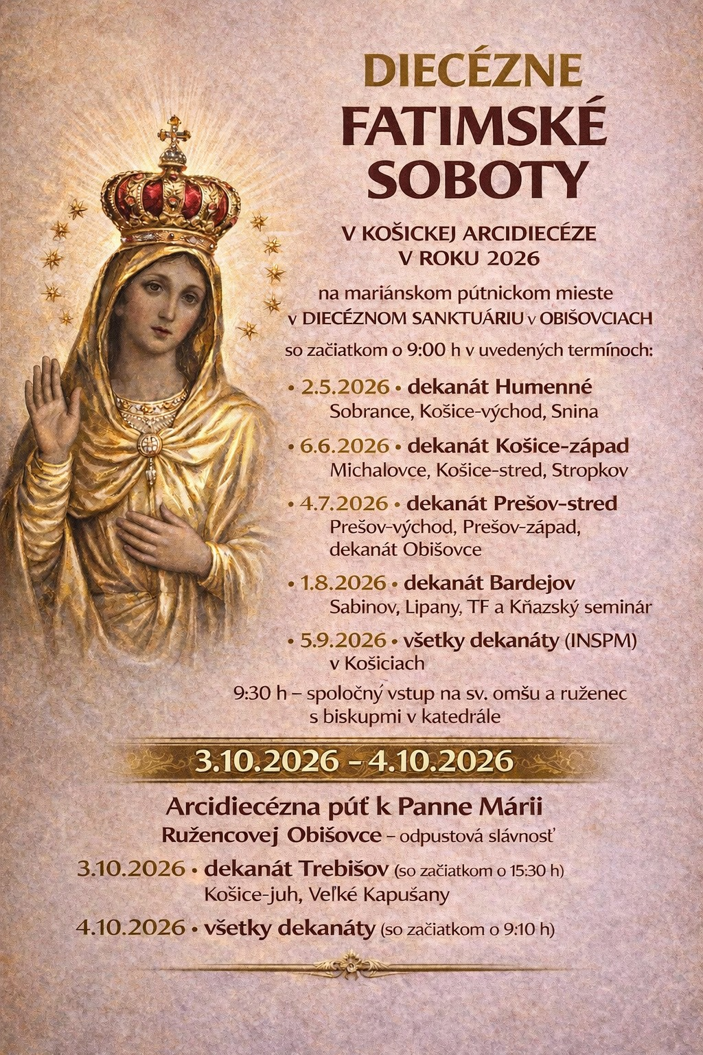 Diecézne sanktuárium v Obišovciach so začiatkom o 9.00 hod., každú prvú sobotu v mesiaci od mája do októbra.